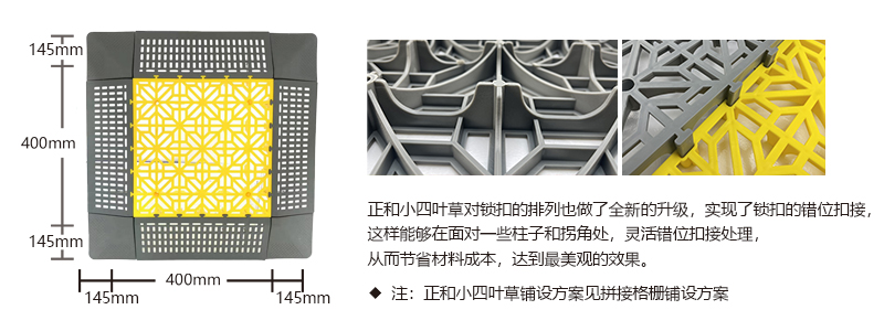 正和小四葉草采用通扣設計,可以確保產品鋪設完成后在任何區域單獨取出,極大的方便了客戶后期局部清理泥沙等,給店面的日常衛生維護提供了很好的基礎。