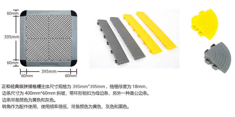 一套完整的拼接格柵產(chǎn)品由主體格柵、公邊條、母邊條、轉(zhuǎn)角四部分構(gòu)成,主體格柵的尺寸為395mm*395mm*18mm,厚度為18mm,邊條尺寸為400mm*60mm*8mm,轉(zhuǎn)角為扇形結(jié)構(gòu),尺寸規(guī)格為60mm*60mm*18mm。 拼接格柵通過一個簡便互鎖接口設(shè)計,重量輕,可拆卸,易于安裝。無需使用工具,即可快速構(gòu)建起堅實的展示地板地面。 拼接格柵重量輕、結(jié)構(gòu)緊湊,便于運輸或儲存?蓮V泛用作汽車4S店展臺地板、汽車美容店地面、汽車貼膜車間、美容車間以及客戶休息室等場所,同時也適用于展覽、展會等臨時性場所的地面鋪設(shè)。在幾乎所有有水的場所拼接格柵都能使用。