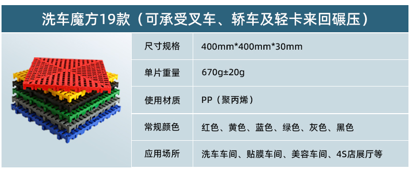正和19款洗車魔方是正和公司2019年推出的新品,該產(chǎn)品厚度為30毫米,采用更為粗壯的加強(qiáng)筋和更為寬大的面層設(shè)計(jì),是目前載重、抗沖擊效果最好的產(chǎn)品。