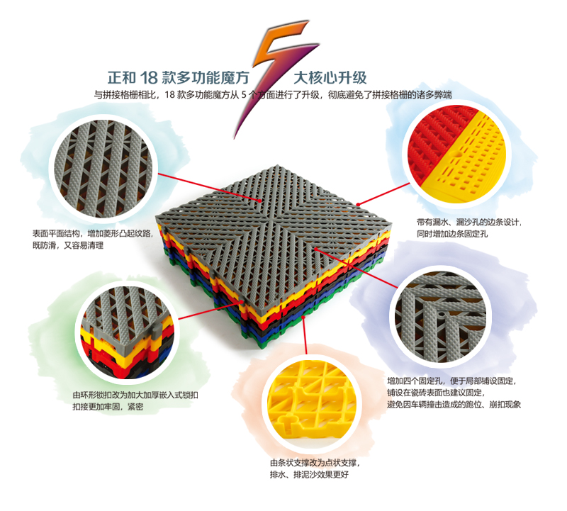 5、拼接格柵局部鋪設容易滑動,多功能魔方增加固定孔,局部鋪設可固定,更牢固;